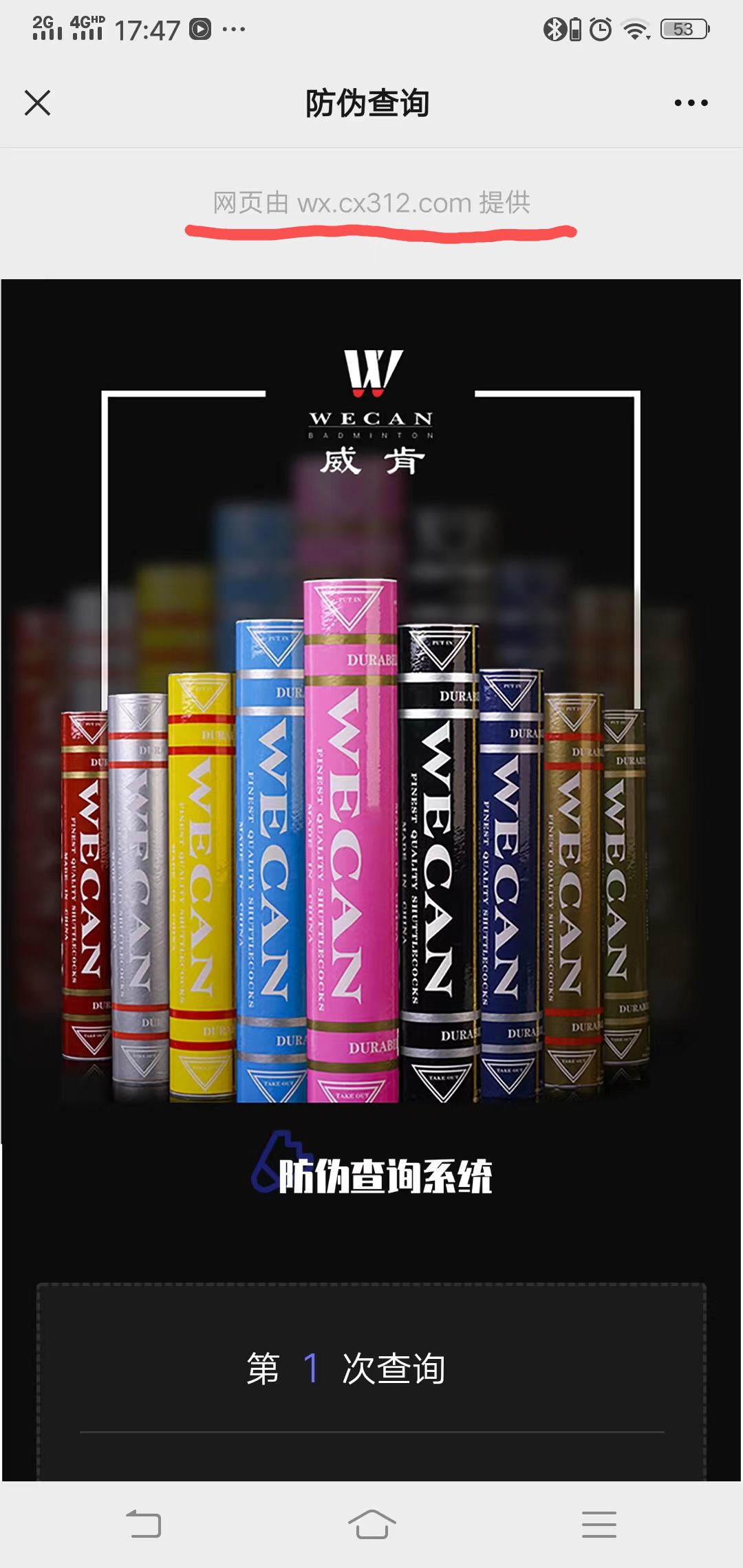 2022年公司升級全部的羽毛球防偽標識別系統(tǒng)(見圖),左邊為鐳射防偽,右邊刮開涂層掃碼查詢真?zhèn)危嚎娠@示首次查詢時間及次數(shù),同時請按住頁面往下拉,在頁面頂端可顯示公司防偽網(wǎng)址:wx.cx312.com(見圖),請各位消費者謹慎識別。